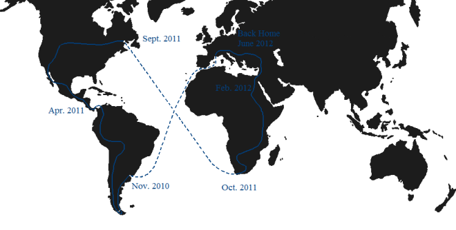 The planned route will take us through America, Africa, Middle East and back to Europe. Our actual route can be followed on Google Earth by downloading the files below.