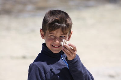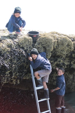 Boys take advantage of the low tide to go fishing mussels. They bring back two kilos that Matthieu prepares on the beach.