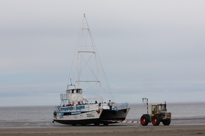 Everyone puts his life jacket on to go and see the whales. Here there is no dock, and the boats are brought to the sea by tractors.