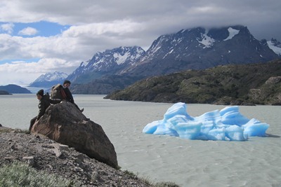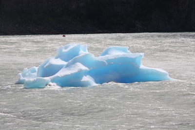 We admire our first icebergs, floating in a grey lake.