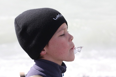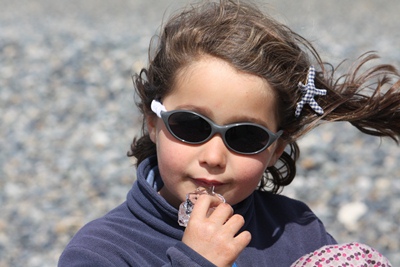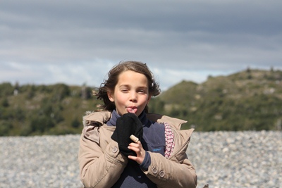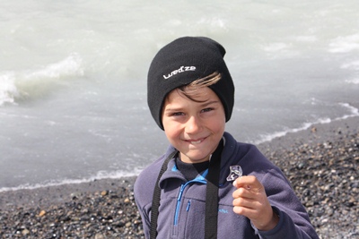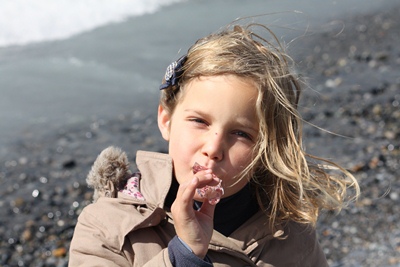 Shiny pieces of iceberg are rejected on the beach and children are eating them with delight!