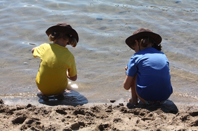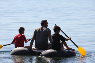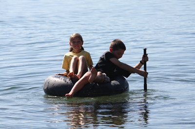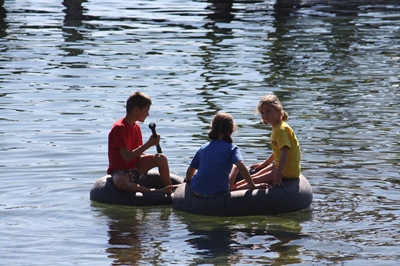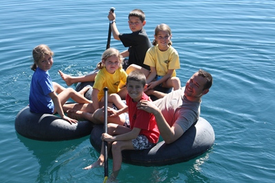 Matthew prepares a homemade raft with a few tubes, and the children are very excited about it.