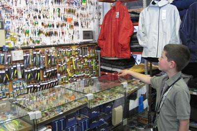 Tugdual, who is dreaming to fish in these clear waters, buys new hooks.