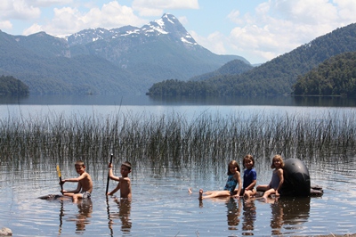 Children arrange a canoe with a tree trunk, and spend the day in the water.