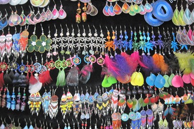 In front of an array of earrings, Tugdual says: "Oh, baits for fishing."
