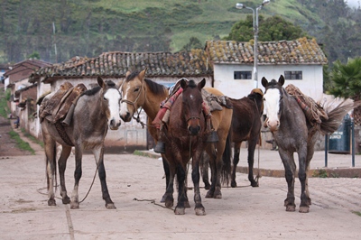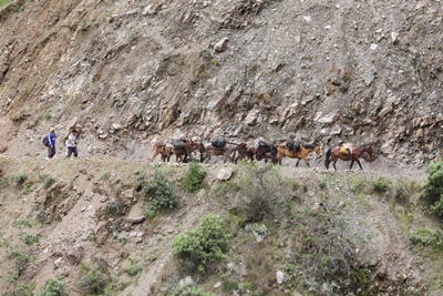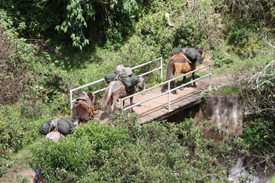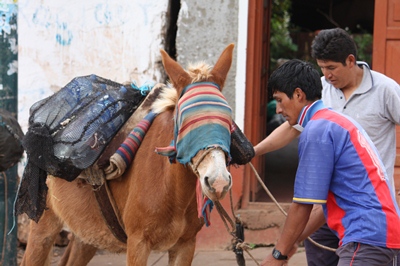 In the early morning, bags and supplies are loaded on six animals by our two guides.