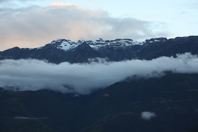 The clouds lift a bit, allowing us to glimpse the snowy peaks surrounding us.