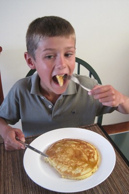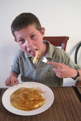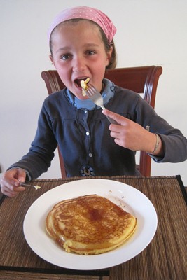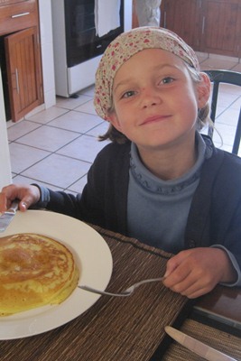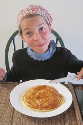 Tugdual goes and have a look in the kitchen when Marianna makes pancakes for breakfast.