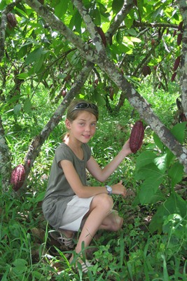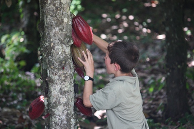 So, Tugdual who wants to try it harvests a cocoa pod along the road.