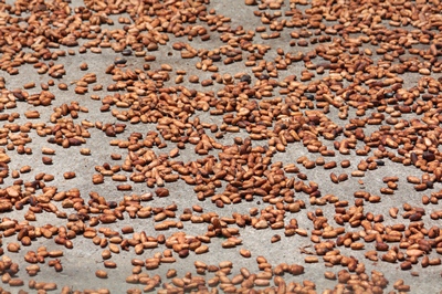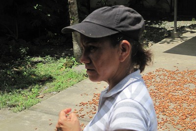 A woman explains us that the cocoa beans are sun dried and then roasted before being ground.