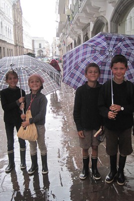 But it starts to rain, and we have to buy umbrellas.