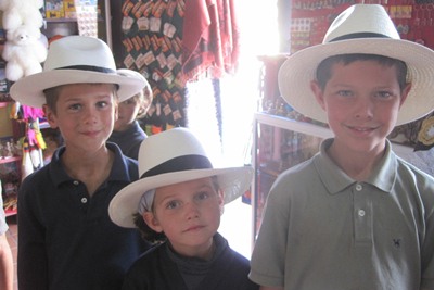 In a souvenir shop, children try Panama hats, which are made in Ecuador as their name does not suggests.