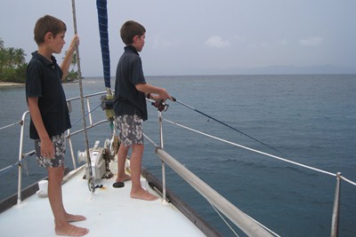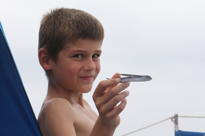 The boys try to fish from the deck of the boat, but finally Tadeusz is the one who catches a nice tuna fish.