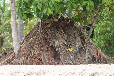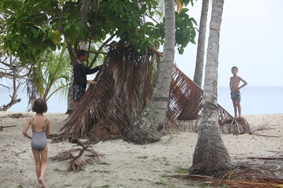 As rain threatens, we build a hut of palm leaves.