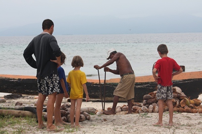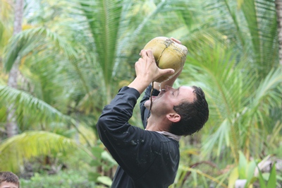 We refresh ourselves by opening some coconuts.