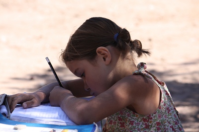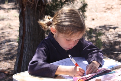 Béatrix, who is doing well in reading, is playing the mistress and is reading the spelling exercice of Tugdual.