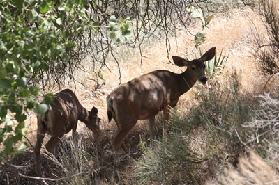 These mule deer are not frightened at all, and come here seeking water and shade.
