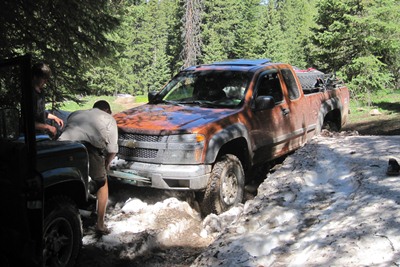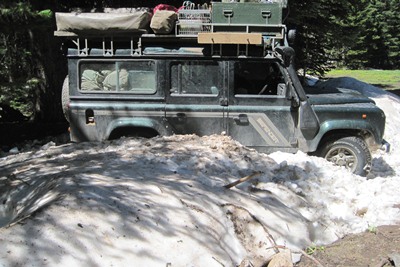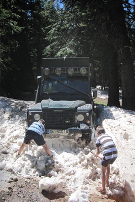 After the pass, the road is cut by several snow fields. We cross three of them, but a vehicle is stuck in the fourth one.