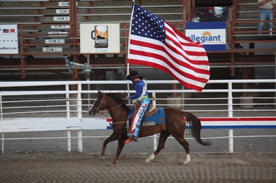 The show begins with the national anthem, stars and stripes banner in the wind.