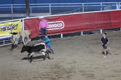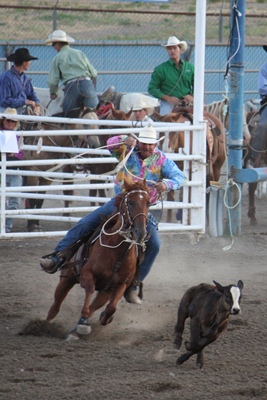 The calf dashes, a cowboy following it.