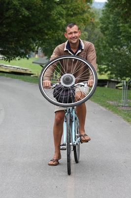 Unable to repair, Matthieu has to get a spare tire in the nearest town about ten kilometers away.