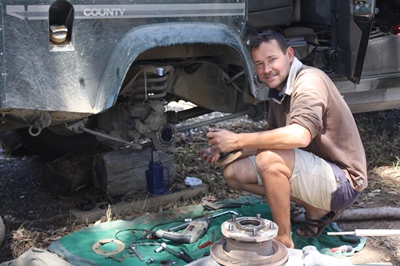 Matthieu, who broke his finger when changing the rear shocks absorbers, decides to go to a garage to change the front ones.