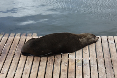 In the marina, seals share the docks with luxury boats.