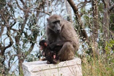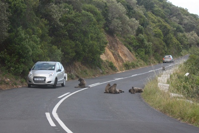 Baboons stand on the way. They do not seem to be afraid of cars and are not willing to move.