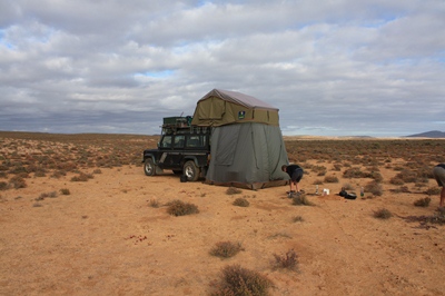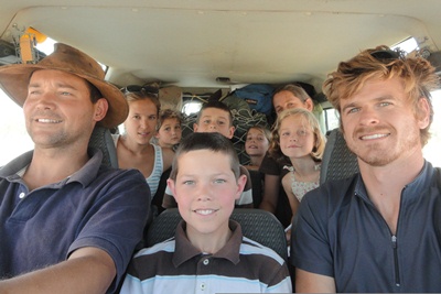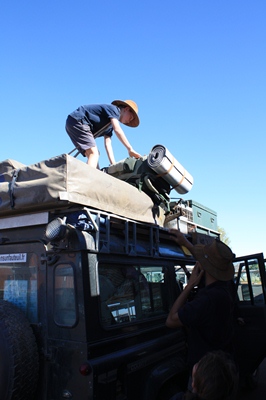 We load the bags on the roof rack, and of we enter nine of us in the Landy: fun guaranteed !