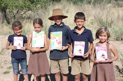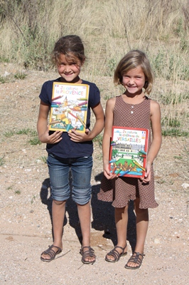 Children take advantage of the stop to start playing with their new books.