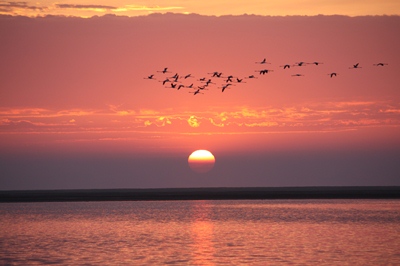 and we enjoy a beautiful sunset with a flight of flamingoes.
