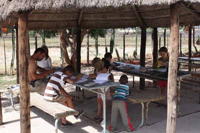 Beatrix plays with a new friend while the older ones study their lessons.