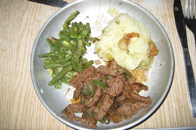 Eggs mimosa as a starter and beef fillet, mashed potatoes with olives and green beans with garlic as main course.