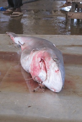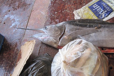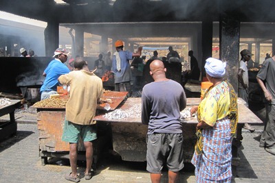 Large fishes are sold on the stalls, but the small ones are deep-fried nearby, in a place looking more like a forge than a chip shop !