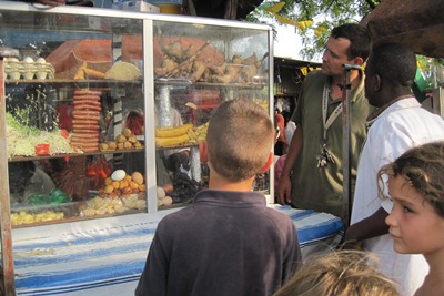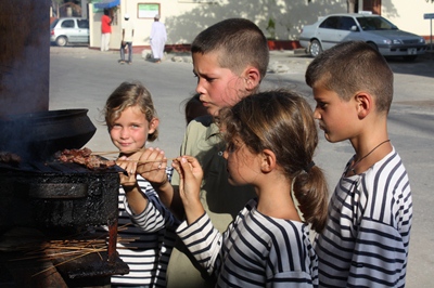 We finally eat delicious beef kebab in the street.