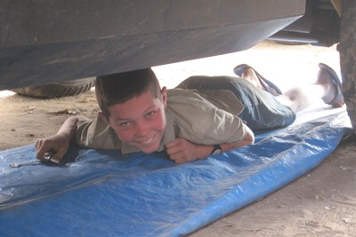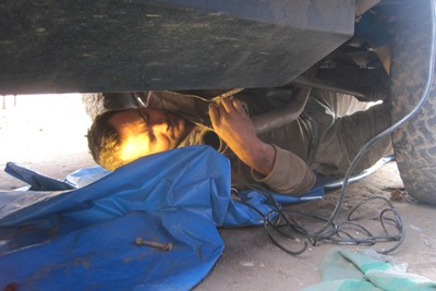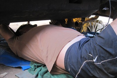 Lying under the car, Matthieu confirms that there is indeed a problem.