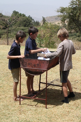 The boys prepare the barbecue.