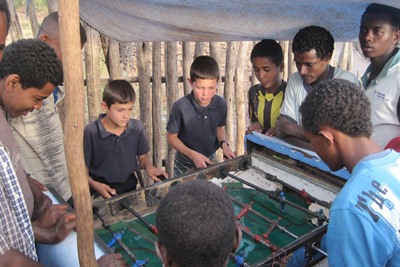 During the lunch break, the boys participate in a table football contest. The table is in really bad condition, but they have good fun.