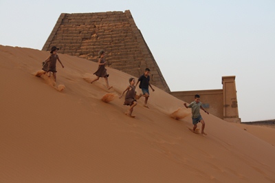 The children climb on a pyramid to jump in the dunes, but they are whistled by the guard: run for your life !