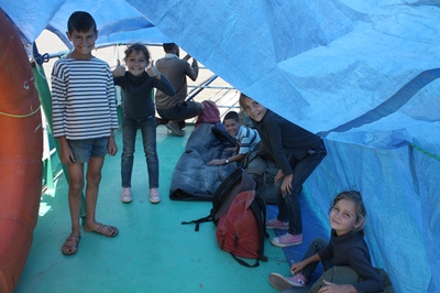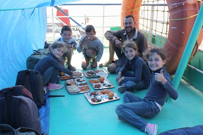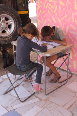 Children work on the terrace waiting for the boat. Not easy to get the right information on the date of departure.