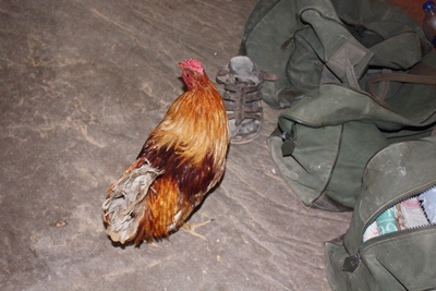 We are awakened at dawn by the crowing of Demokrator who has taken up residence in our tent !